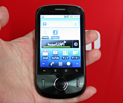 240×320ドットの2.8型液晶を搭載。ホーム画面のPocket WiFi ウィジェットをワンタッチするだけで、簡単にWi-Fiルータとして使うことができる。無線LANのアクセスポイントがない場所でも、イー・モバイルのサービスエリアであれば、Wi-Fi対応機器を最大5台まで同時にインターネットに接続することができる。