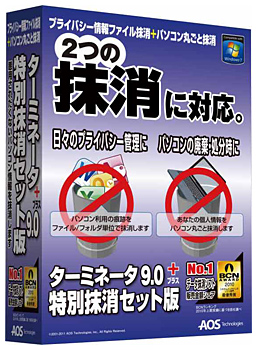 AOSテクノロジーズは、PCに残っている情報を抹消するソフト「ターミネータ9.0plus ファイル選択抹消」と、HDD抹消ソフトをセットにした特別版「ターミネータ9.0plus 特別抹消セット版」を、12月17日に発売する。
