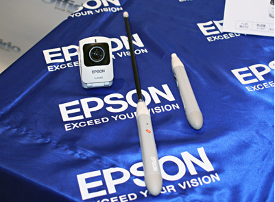 「EB-900T」は、電子黒板ユニット「ELPIU02」をセットすると、投写面上で、付属の電子ペンをマウスとして使用するPC操作や、文字や図形の書き込みなどができる。実勢価格は21万円台後半の見込み。「ELPIU02」単体の実勢価格は9万円台後半の見込み。