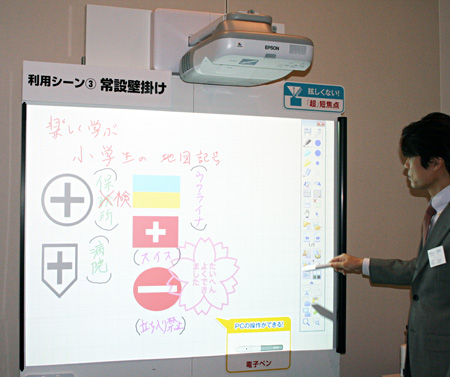 発表会でエプソン販売の中野修義・取締役 販売推進部長は、「プロジェクターは黒板サイズに投影でき、すべての生徒が見やすい。また、持ち運んで使うことができるので、テレビよりも学校で使う大画面装置として適している。当社は、見るだけの大画面ではなく、使うことのできる電子黒板をプロジェクターで提案し、教育の情報化――ICT化をサポートしていく。新製品の電子黒板機能内蔵モデルとしては、壁掛けタイプと既存のプロジェクターにセットするユニットタイプを用意した。予算や環境に合わせて選んでほしい」と語った。