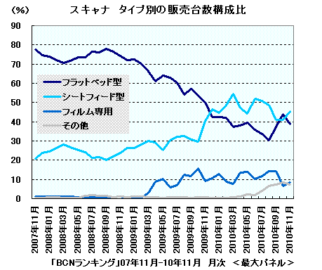 2010年11月「BCNランキング」でスキャナ全体のタイプ別の販売台数の割合をみると、シートフィード型の構成比は45.5%。09年12月、紙をガラス面に置いて下から光を当てて読み取る「フラットベッド型」を逆転し、以降、スキャナの主流になっている。一方、フラットベッド型は38.9%だった。フラットベッド型はプリンタの複合機に搭載されていることが多く、単機能機としての需要は縮小しつつあるようだ。