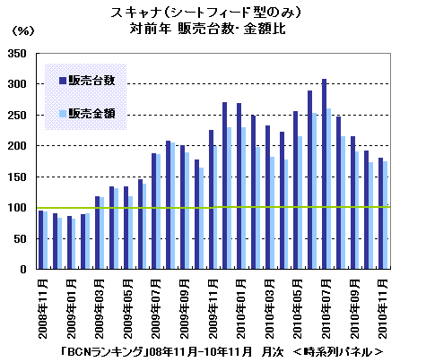 09年3月以降、シートフィード型スキャナの市場は、前年同月比で前年越えを続けており、11月は販売台数179.9%、販売金額174.0%だった。10年5月のアップルiPad発売以降は、電子書籍のコンテンツ不足による「自炊ブーム」が後押しして、一層盛り上がりをみせている。しかしもちろん、主要用途であるビジネスシーンで業務の効率化のために導入するというニーズも高まっている。