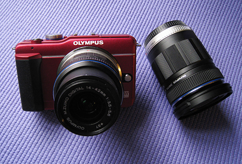 ダブルズームキットの標準ズームレンズは、焦点距離が28-84mm(35ミリフィルムカメラ換算)の「M.ZUIKO DIGITAL 14-42mm F3.5-5.6 II」で、重さは112g。望遠ズームレンズは80-300mm(35ミリフィルムカメラ換算)の「M.ZUIKO DIGITAL ED 40-150mm F4.0-5.6」で、重さは190g。