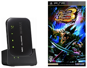 新規契約者すべてに「AtermWM3500R」専用クレードル(左)か『モンスターハンターポータブル3rd』を提供