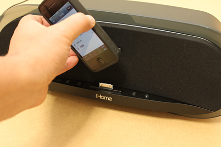 スピーカー前面のDockコネクタにiPod/iPhoneをセットするだけで使える。Dockコネクタ部分はわずかに動くようになっており、厚みが異なるiPodやiPhoneをしっかりと固定できる。また、そんなに厚くないケースなら付けたまま装着することも可能だ。装着するとすぐに充電が始まる。
