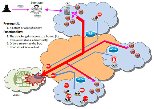 分散型サービス拒否(DDoS)攻撃の実行方法の例