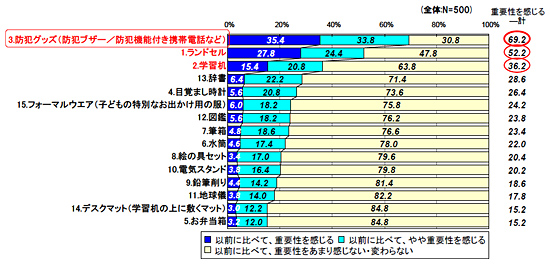 また、自分の子どもの頃や上の子どもの入学時などに比べてより重要性を感じる入学準備品は、「防犯グッズ」が69.2%でダントツのトップだった。