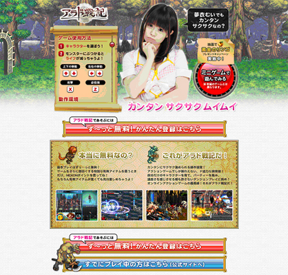 ミニゲームでは、「誰でもカンタン」という「アラド戦記」の特徴をアピールするため、亀甲縛りされている栗山夢衣さんがキャラクターとして登場。プレーヤーは栗山夢衣さんを操作し、敵を倒していく。栗山夢衣さんのコスチュームは「格闘メイド」「うさみみプリースト」「水着剣士」の3種類から選べ、亀甲縛りの状態でも、サクサクと簡単に敵を倒す爽快感が味わえる。