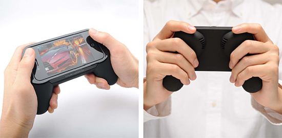 iPhoneやiPod touchに装着してゲームアプリを楽しむためのグリップ。ゲームコントローラーのようにして使用することで操作性が向上するほか、手の負担も軽減できる。スピーカーをふさがずに、裏面の穴からしっかり音が出る設計。熱も逃がすことができる。