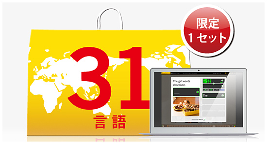 12か月間利用できるオンライン版31言語が通常価格120万3800円のところ、アップルのノートPC「MacBook Air」を付属して50万円で販売する。限定1セットで、申し込み多数の場合は抽選。