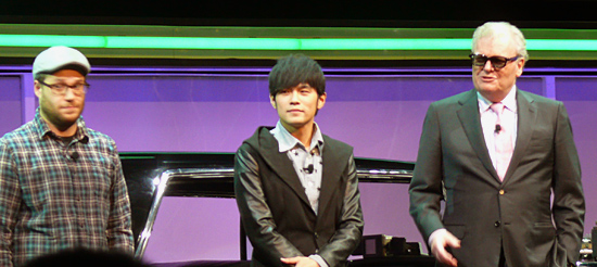 会見開始と同時に、公開予定の映画『グリーンホーネット』の3D予告編が流れた。予告編が終わると同時に、ステージの中央が回転、映画で使われた車が登場し、その車のなかから出演者とハワード・ストリンガーCEOが登場した。