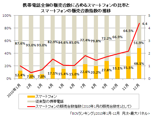 前述の通り、2010年12月の携帯電話全体の販売台数に占めるスマートフォンの比率は5割目前の48.1%に達した。しかし、2010年年間を通してみると、スマートフォンの比率は21.4%にとどまり、依然として従来型の携帯電話の販売台数のほうが多かった。しかし、昨年秋以降の売れ行きをみる限り、逆転は時間の問題だ。