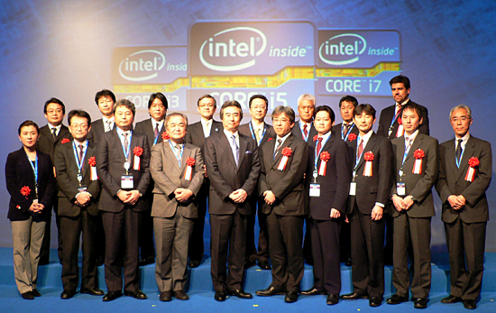 最新の第2世代インテルCoreプロセッサー・ファミリー搭載製品を開発・発売するPCメーカー代表者などと記念撮影