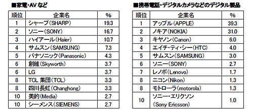 2010年、中国で最も印象に残ったブランドは「シャープ」、ネット調査