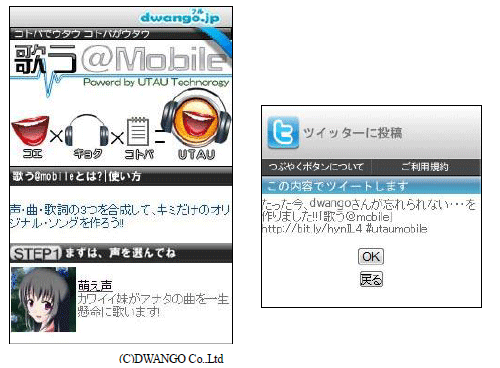 「歌う@mobile」のページイメージ(左)、Twitterへの投稿イメージ(右)