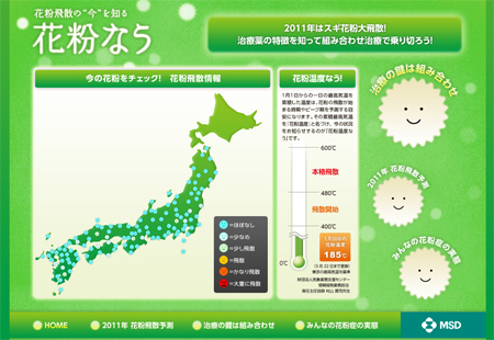 MSDでは、その累積最高気温を「花粉温度」と名づけ、「花粉温度」を示す累積温度計「花粉温度なう!」をMSD本社(東京都千代田区1-13-12 北の丸スクエア)の1階正面玄関ホールに設置。1月21日から3月22日まで、毎日「花粉なう」のパソコンサイト上の「花粉温度」を更新する。1月20日時点の「花粉温度」は185度。このほか、花粉症の症状、治療薬の種類、適切な治療、セルフケアなど、花粉症治療に関する情報を掲載する。