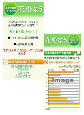 花粉情報サイト「花粉なう」のモバイルサイトの画面イメージ。リアルタイム花粉情報サービスは1月31日から開始する