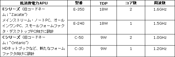 低消費電力プラットフォーム(旧開発コードネーム「Brazos」)は、日常のコンピューティング・エクスペリエンスを向上させるもので、メインストリーム・ノートPC、オールインワンPC、スモールフォームファクタ・デスクトップPC向けに設計したEシリーズ(旧コードネーム“Zacate”)、HDネットブックなど、新たなフォームファクタ向けに設計したCシリーズ(旧コードネーム“Ontario”)を1月26日から提供する。