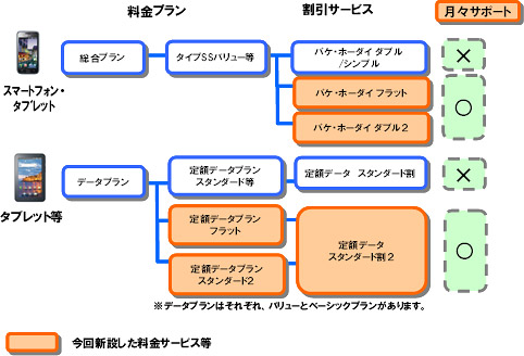 同時に、端末購入時にこれらの定額プランを申し込むことを条件に、機種ごとに一定額を毎月の利用料金から最大24か月間割り引くサービス「月々サポート」を開始する。提供開始時点の対象機種は、GALAXY S、GALAXY Tab、LINX 3D SH-03C、REGZA Phone T-01Cなどのスマートフォンやタブレット端末、ブックリーダーなど。