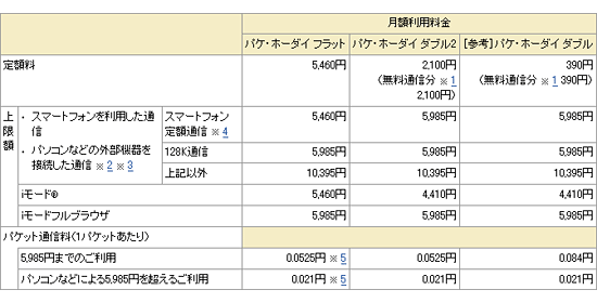 上限額は、パソコンなど外部機器を接続した通信やiモードフルブラウザの利用など、利用形態によって異なる。スマートフォン定額通信のみ利用した場合の月額料金は、「パケ・ホーダイ フラット」が5460円、「パケ・ホーダイ ダブル2」が2100円~5985円(パケット通信に利用できる2100円分の無料通信分を含む)。