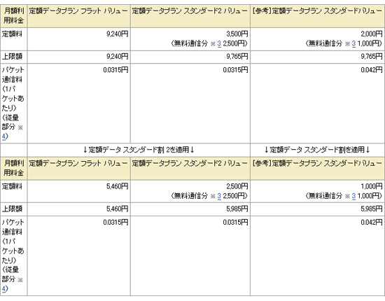 「定額データプラン フラット バリュー」は、従来の「定額データプラン スタンダード バリュー」(割引後)の上限額5985円より525円安い。2段階型の「定額データプラン スタンダード2 バリュー」は、「定額データプラン フラット バリュー」に比べ定額料(下限額)を下げた。7.9万パケットまでは2500円で利用でき、19万パケットで上限額に達する。従量課金部分のパケット通信料は1パケットあたり0.0315円。