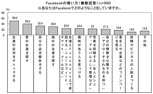 Facebookユーザーに使い方をたずねたところ、「友達の近況をチェックする」が50.0%で最も多く、続いて「昔の友達を探す」39.4%、「自分の近況を報告する」32.4%、「海外の友達を探す」30.0%の順となった。