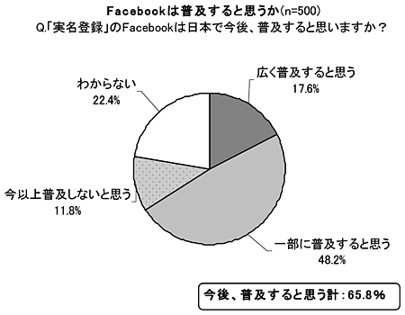 実名登録を推奨している「Facebook」は日本で普及すると思うか、という問いに対しては、「広く普及すると思う」が17.6%、「一部に普及すると思う」が48.2%で、日本で普及すると思う人の合計は65.8%だった。