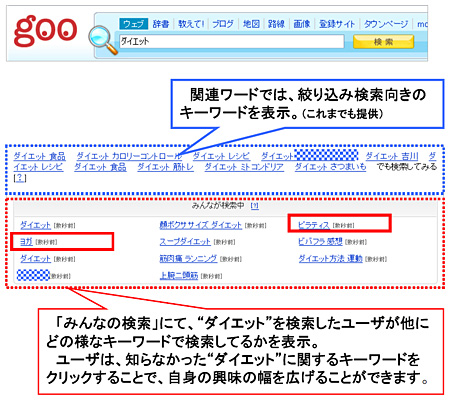 例えば、「ダイエット」について検索した場合、従来の関連ワードでは「ダイエット食品」「ダイエット レシピ」など、主に検索結果を絞り込むのに有効なキーワードが表示されたが、「みんなの検索」では、「ヨガ」や「ピラティス」といった「ダイエット」という単語を直接含まないキーワードも表示する。