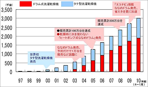パナソニックは、1997年に「洗乾ランドリーム」という愛称で、国産初のドラム式洗濯乾燥機を発売。03年に発売した世界初の「ななめドラム洗濯乾燥機」は、予約だけで1万台を販売するなど話題になった。05年には、世界初のヒートポンプ搭載ドラム式洗濯乾燥機を発売。また同年には、販売累計100万台を達成した。08年に販売累計200万台、11年1月に業界で初めて累計300万台を販売した。