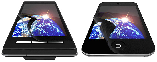 気泡が入らない液晶保護フィルム(左からREGZA Phone T-01C専用の「BSEFT01」、iPod touch用の「BSEFIPT」)