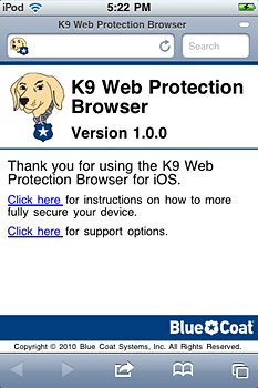 ブルーコートシステムズ(マット・ベネット マネージングディレクター)は、子どもに不適切なコンテンツを含むウェブサイトへのアクセスを阻止するiPhone、iPad、iPod touch用ブラウザ「K9 Web Protection Browser for iOS」の無償提供をApp Storeで開始した。料金は無料。
