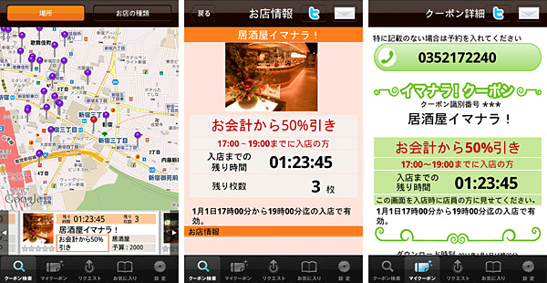 「イマナラ!」は、スマートフォンなどの位置情報を活用し、近くの店舗が発行する「30分以内に来店したらお会計50%オフ」といった時間限定のタイムセールクーポンを枚数を限定配信するサービス。飲食店を中心に、全国で1万2000を超える店舗が登録している。ユーザーは、店舗側が空席状況などに応じて発行したクーポンを無料でダウンロードし、有効時間内にお店でクーポン画面を提示するだけで割引を受けられる。