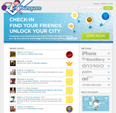 行動を起こすたびに「Badge」と呼ばれるアイテムがもらえるほか、特定の場所に他のユーザーより多く行ってポイントを稼ぐと、「Mayor」と呼ばれるその場所の長になれるなど、ゲーム性も高い。また、チェックインした場所でコメントやサービスの評価などを書き残せる「Tips」機能を搭載しており、他のユーザーが投稿したコメントや評価も確認できる。