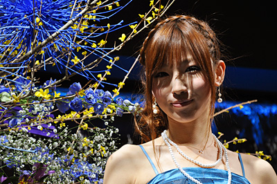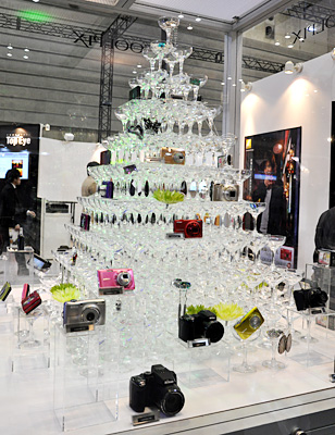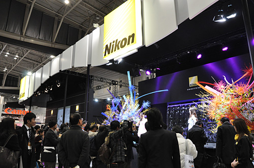 カメラと写真映像の展示会「CP+2011」。ニコンは、ブルーとオレンジを基調とした生け花をブースの正面に配置し、デジタル一眼カメラで撮影できるようにしている。また、シャンパンツリーとともにコンパクトデジタルカメラ「COOLPIX」の新製品を展示し、来場者の目を楽しませている。