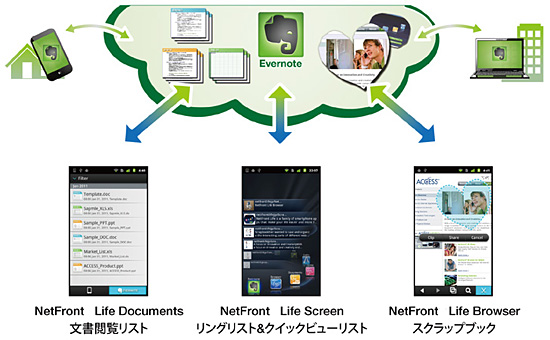 ACCESSは、アプリシリーズ「NetFront Life」のブラウザ、ドキュメントビューワ、スクリーン機能を、情報整理に便利なクラウドサービス「Evernote」と連携し、それぞれ「NetFront Life Browser v2.0」「NetFront Life Documents v2.0」「NetFront Life Screen v2.0」として提供すると発表した。2月9日にAndroidマーケットで配信を開始している。さらに、Android端末にDLNA機能を付加するアプリ「NetFront Life Connect」の配信を2月下旬に開始する。