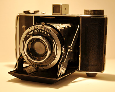 1938年、ZUIKOレンズをはじめ、ボディ、シャッターなど、オリンパスが自社パーツだけで初めてカメラを製造した記念すべき中判カメラ「セミオリンパスII型」を展示している。カメラファンは必見だ。
