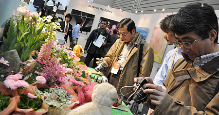 若い女性を中心に人気を集めているミラーレス一眼「OLYMPUS PEN」。ブースの入口付近には、かわいらしい小物とともに製品を展示。1月に発売した新製品「OLYMPUS PEN Lite E-PL2」など、実機に触って撮影することができる。