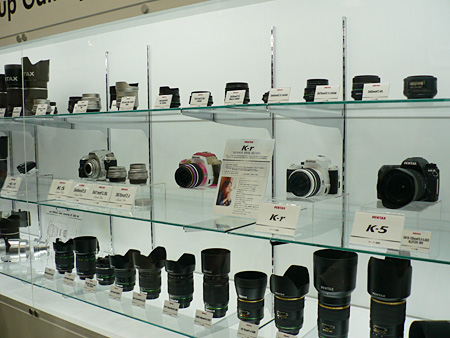 ショーケースに並ぶ「K-r」「K-5」と交換レンズ群