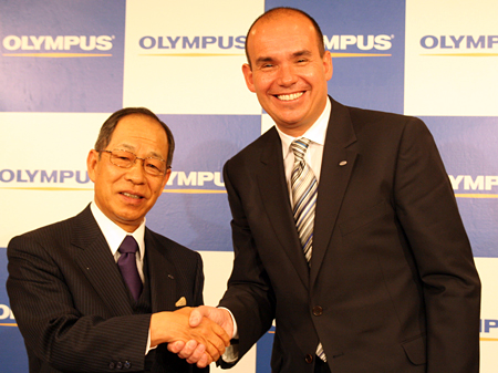 オリンパス(菊川剛社長)は、2月10日に開催した取締役会で社長の交代を決定した。4月1日付けで、現在オリンパス執行役員/独オリンパス・ヨーロッパ ホールディング社長のマイケル・シー・ウッドフォード氏が社長に就任する。現在の菊川社長は会長に就任する。両氏は「二人三脚」というキーワードを強調し、協力して経営に傾注していく方針を示した。