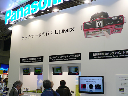 カメラと写真映像の展示会「CP+2011」。パナソニックのブースでは、コンパクトタイプ、ミラーレス一眼ともにタッチ操作に対応した「LUMIX」の最新モデルを中心にアピールしている。