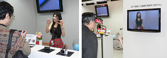 別売の3D交換レンズで3D写真撮影に対応するミラーレス一眼「DMC-GF2」や、3D写真を合成する「スライド3D機能」を備えた新製品「DMC-FX77」「DMC-TZ20」など、デジタルカメラの3D対応もアピール。ブースでは、「DMC-GF2」の3D撮影が体験できる。