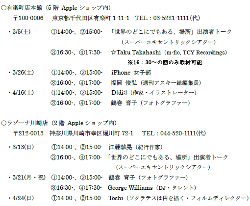 そのほか、映画「世界のどこにでもある、場所」に出演する坂田鉄平さん・嶋田真さん、都恋堂がプロデュースする「iPhone 女子部」、『週刊アスキー』総編集長の福岡俊弘さん、フォトグラファーの鶴巻育子さん、紀行作家の江藤誠晃さん、DJ・タレントのGeorge Williamsさんなどが登場する。