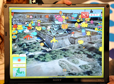 「Xi」のデータ通信カードを挿入したPCを持って地図の上に立つと、PC下部のウェブカメラが地域マークを認識して位置情報を取得。Google Earthの映像と、花粉センサが取得している花粉飛散量をキャラクターの数に変換して組み合わせ、PCに送信する。残念ながら、実用化の予定はないという。