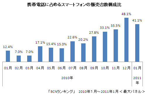 図1は、BCNランキングで携帯電話全体に占めるスマートフォンの販売台数構成比だ。携帯電話とスマートフォンの割合は、ソニー・エリクソン・モバイルコミュニケーションズの「Xperia SO-01B」が発売された2010年4月頃から伸びはじめ、6月のアップル「iPhone 4」発売を受けて、7月には2割を突破。10月の「GALAXY S」発売で勢いはさらに加速し、12月にはほぼ半数に達している。スマートフォンが、今後の携帯電話市場の中核になることは間違いない。