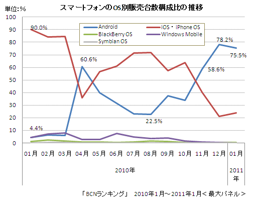 昨年後半から急激に高まったスマートフォン人気を支えているのは、Android OSを採用したスマートフォンだ。Android搭載スマートフォンは、2009年7月に発売されたHTCのGoogleケータイ「HT-03A」が国内初。iOSの「iPhone」対抗馬として注目を集めたが、BCNランキングでOS別の販売台数構成比(図2)をみると、Androidは2010年1月時点ではわずか4.4%と、iOSにまったく歯が立たなかった。