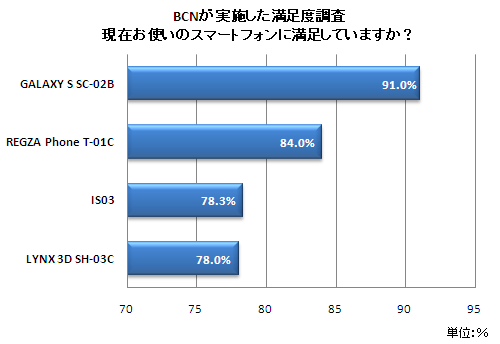 BCNは、2月10~16日、この「GALAXY S」をはじめ、BCNランキングの機種別販売台数で上位に入ったAndroid搭載スマートフォン「REGZA Phone T-01C」「「LYNX 3D SH-03C」「IS03」の利用者を対象に、「スマートフォンユーザー満足度調査」を実施。機種ごとに300人の利用者に対して、ウェブアンケート方式で調査を行った。