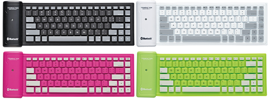 iPad/iPhone 4/iPhone 3GS(iOS 4.0以降)やWindows 7搭載パソコンなどとワイヤレスで接続する超軽量のBluetoothモバイルキーボード。素材はシリコンで、コンパクトに丸めて持ち運べる。キー数は85キー、キーピッチは13mm。電源は内蔵リチウム電池で、パソコンのUSBポートから充電する。