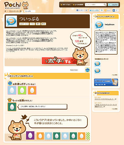 サービス開始当初は、約30のコンテンツを対象に提供。今秋からは「ポチ」のウェブサイト上でコンテンツを登録できる仕組みを公開し、本格的に展開していく。2012年3月末までに5000コンテンツの参加、利用者10万人を目指す。