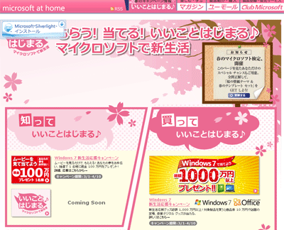 キャンペーンの詳細ページに飛ぶリンクを掲載したキャンペーンサイト「Microsoft At Home」(http://www.microsoft.com/japan/athome/campaign/)を開設。全問正解すると、「桜の壁紙テーマ&春のテンプレートセット」をプレゼントする検定コンテンツ「春のマイクロソフト検定」も用意している。