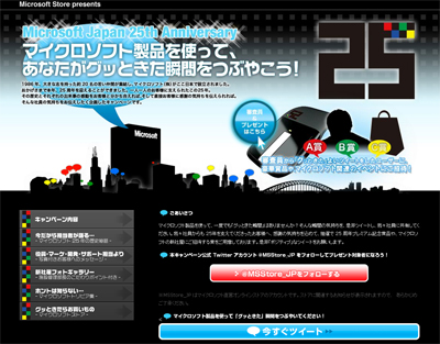 Twitterキャンペーンは、1986年のマイクロソフト(現日本マイクロソフト)の設立から、今年で25周年を迎えることを記念したもの。キャンペーンの公式Twitterアカウントをフォローし、指定のハッシュタグを含めて、マイクロソフト製品を使って「グッと来た瞬間」をツイートすると、抽選で25周年プレミアム記念賞品などをプレゼントする。応募期間は3月1日~4月28日23時59分。